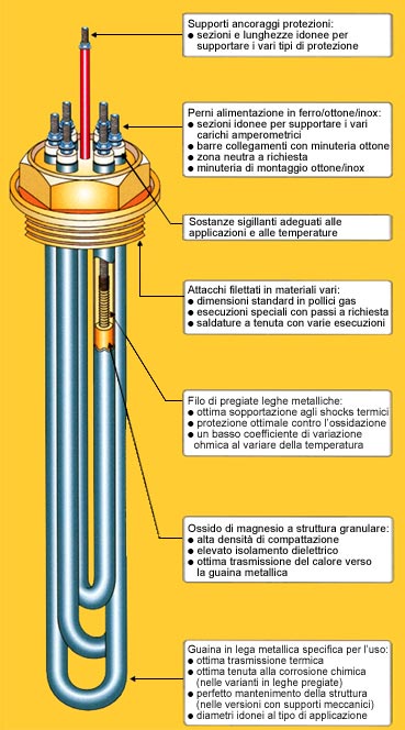 In view of the multitude of fluids that it is possible to heat, and in view of its versatility to take up various shapes, the immersion heaters are extensively used in all industrial and home sectors, among them: hot water boilers construction, food warmers, industrial and home dishwashers, industrial and home washing machines, fryers, dry cleaning and laundry machines, photographic development machines, industrial boilers, distillers, sterilizers, autoclaves, water/oil thermoregulators, underground tanks, steam production boilers, ice-cream machines, beverages automated dispensers, industrial water heaters, solvents recovery machines, metal finishing and washing systems, ultra-sound systems, industrial filtration, water treatment systems, cooling towers, hot interspaces, heat exchangers, galvanic technology, oleodynamic systems, shoes machines, gold and silver industry machines, tanneries machines, antifreeze systems, catering equipment. Countless other sectors of use classify them among the most used.